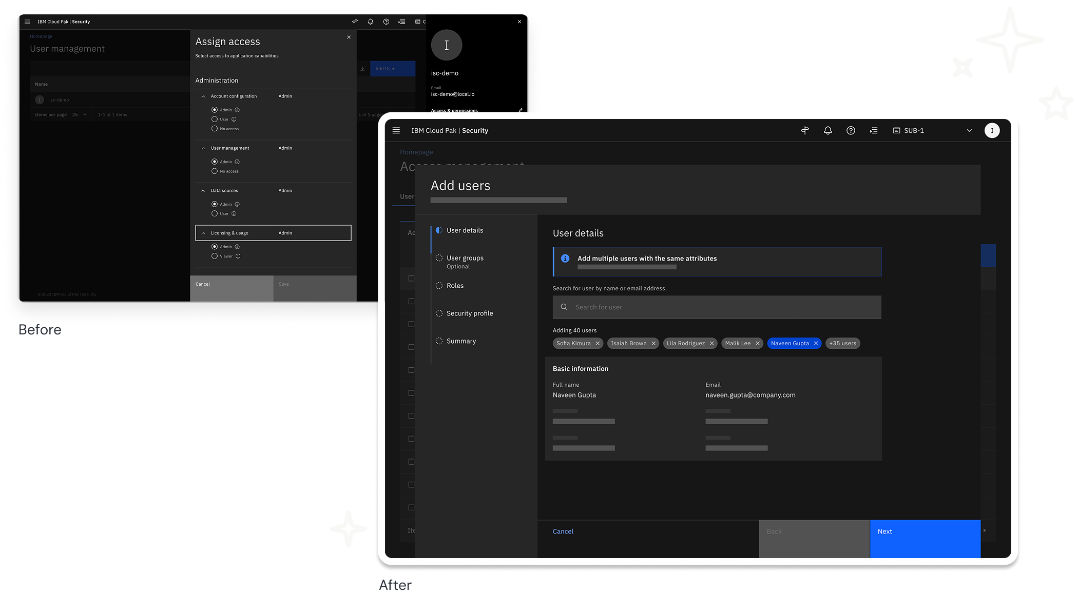 The redesign delivered a centralized hub for managing users, roles, groups, and permissions. Easy workflows and clear explainability reduce the time and effort it takes to . Most significantly, the new permission model removed critical technical blockers that were stalling platform modernization and customer adoption.